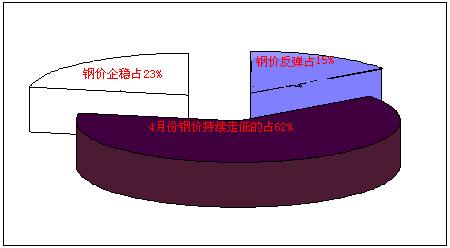 廠家市場調(diào)研情況來看,如下圖所示:對于4月鋼材行情都持不懂看法,其中認為“鋼價能有小幅反彈”的占15%,“鋼價會延續(xù)下跌”的占62%,“鐵價逐漸企穩(wěn)”的占23%。由此可見,過半數(shù)廠家對后市預期仍較悲觀,而且3月之前鋼價的反彈并沒有給廠家?guī)矶啻蟮男判,繼續(xù)看跌的商家較4月初有所增加,最近鋼材市場有降價走勢,漲缺乏實質(zhì)性需求支撐,動力不足,而受低庫存及高成本支撐,下跌難有空間。短期來看,熱軋價格就這么弱勢維持。