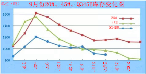如下圖所示:9月份聊城無縫管廠家20#、45#、Q345B等材質庫存均有不同程度下降,從圖中可以看出,從9月6號以后203、45#廠家?guī)齑嫦陆得黠@,Q345B下降幅度趨緩;而20#、45#現(xiàn)貨庫存下降并沒有帶來價格上漲,至9月中旬無縫管價格降幅10元/噸,Q345B成交價格降上個月變化不大,聊城市場報價弱穩(wěn),成交不暢,9月24號以后在沒有新資源到貨。